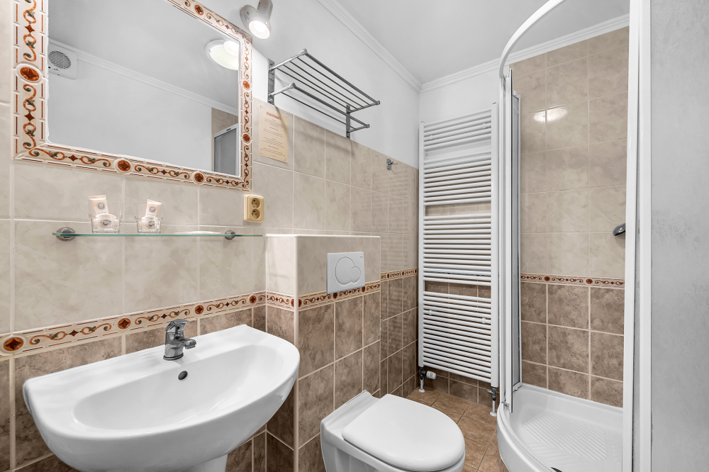 - Koupelna: Moderní koupelna se sprchovým koutem, toaletními potřebami a ručníky.